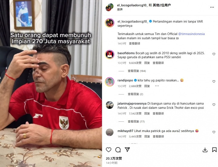 他还表示:那个人就是他(马宁),今晚的比赛好像没有VAR,感谢印尼国家队的所有球员和工作人员,你们今晚的表现非常出色。