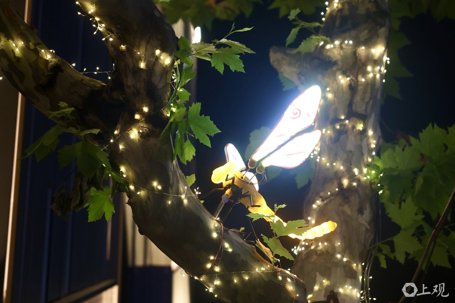 在淮海中路主路上,树形茂盛、游人驻足处,特别增设了“鸟与虫”主题灯饰,以俏皮的造型和灵动的色彩让人眼前一亮,这些“小精灵”或旋转、或振翅,与美好的秋夜相得益彰;
