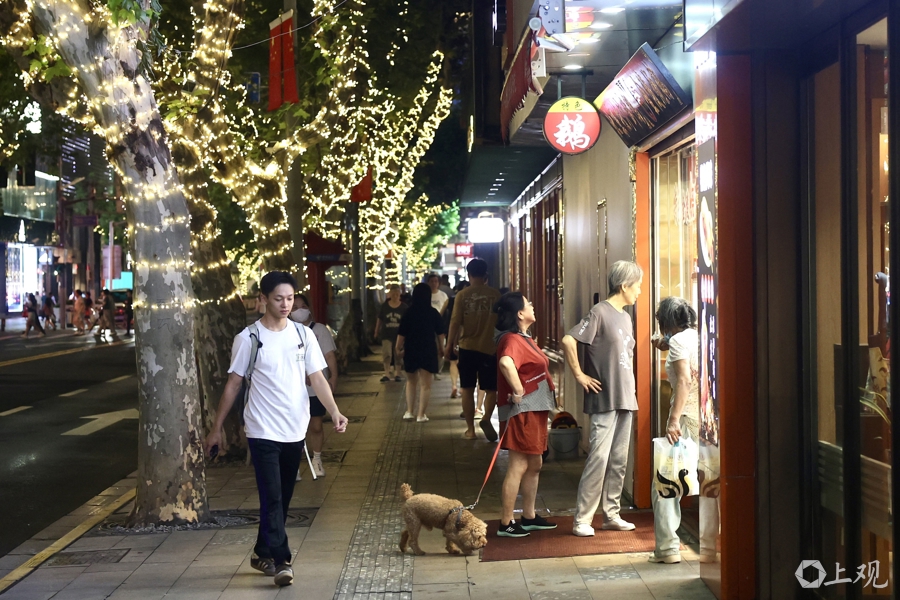 消费者更愿意出门了,对商家来说,夜间的生意机会多了起来。在雁荡路口,“地理学家”咖啡西餐小店,在每天晚上6时后会在店门前设置外摆位。“最近晚上天气变得凉爽了,晚上坐在外摆位的客人多起来了。淮海路树灯又亮起,我们这里外摆位看到的风景非常好,肯定会有更多的客流。”小店店员说。